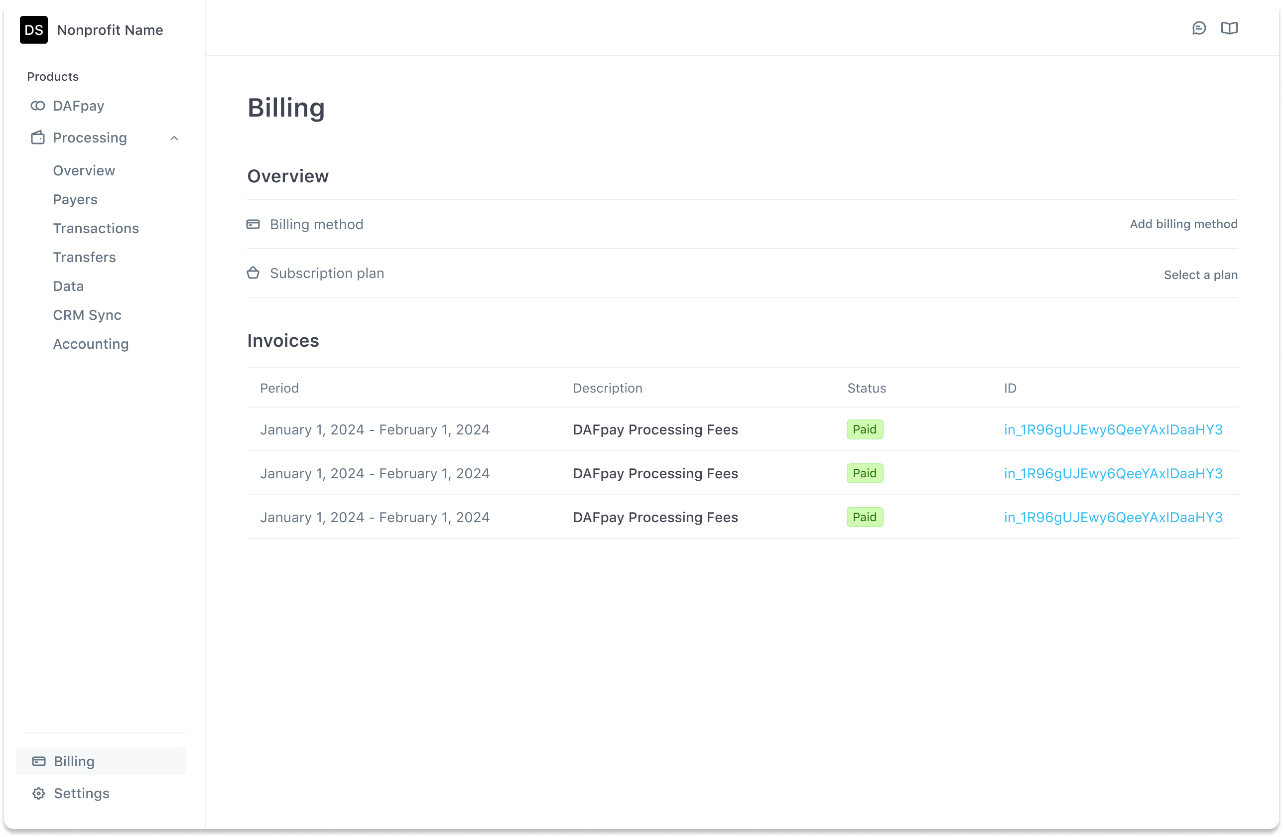 Any fees above your plan’s volume limit (such as excess DAFpay volume or reconciled donation fees) will be charged monthly.
