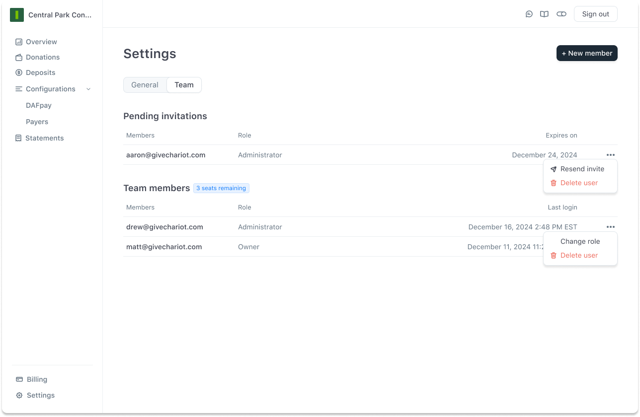Chariot supports multiple user roles so your team can collaborate securely and efficiently. Each role is designed to match the responsibilities of your team—whether you're managing gifts, moving funds, or handling reporting.